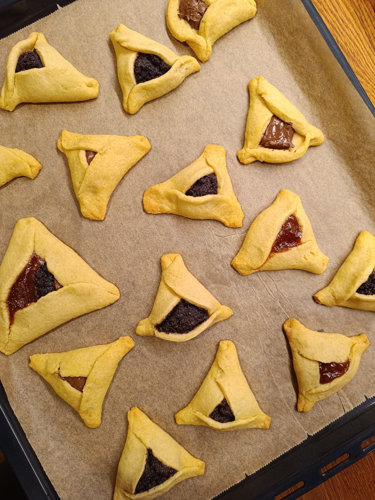 5.Pečieme na 150 - 155 asi 25 minút. Odporúčam nepiecť hamentašen pri vysokej teplote. Plnka začne vrieť a z koláčiku vyvrie.